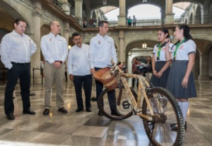 En el Patio Central del Palacio de Gobierno, las estudiantes Yulisa Blanco Moreno y Abigail Mendoza Guevara, quienes obtuvieron medalla de oro en Infomatrix Latinoamérica 2017, explicaron el funcionamiento de una bicicleta con el cuadro de bambú, material amigable con el ambiente y económica.
