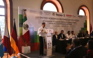 Oaxaca de Juárez, Oax. 28 de junio de 2017. Con la asistencia de ministros de Desarrollo Social de 11 países de Asia, África, Europa y América Latina, el Gobernador Alejandro Murat Hinojosa presidió el encuentro «Objetivos de Desarrollo Sostenible y la Protección Social», en el que ratificó que el Gobierno de Oaxaca se suma a los esfuerzos nacionales e internacionales para establecer una política social que permita la igualdad e inclusión de las y los oaxaqueños.