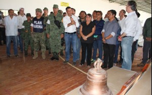 Durante este acto, el Secretario de Educación Pública y el Gobernador Alejandro Murat realizaron la entrega simbólica a la comunidad escolar de la Bandera Nacional y campana que fueron rescatados dentro de los escombros de la escuela.