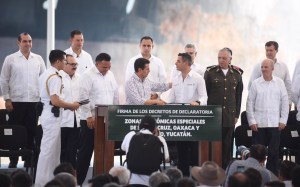 En presencia del Gobernador Alejandro Murat Hinojosa, el Presidente de México Enrique Peña Nieto, firmó este lunes los Decretos de Declaratoria de las Zonas Económicas Especiales (ZEE) de Salina Cruz, Oaxaca y Progreso, Yucatán, con ello se pretende impulsar el crecimiento económico sostenible que reduzca la pobreza, permita la provisión de servicios básicos e incremente las oportunidades para mejorar la calidad de vida de los habitantes del Sur-surestes del país.