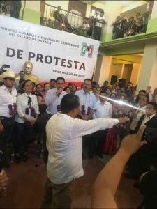 En su participación Lino Velasquez Morales, agradeció a todas las personas que le acompañaron a tan gran evento trascendental para su persona, dijo “Les pido una disculpa, pero también les agradezco el que me puedan otorgar su tiempo ya que este día, tomó una gran responsabilidad y quiero compartirla con las y los campesinos, de también compartir un encuentro de 104 días con nuestros hermanos al interior del estado, donde tendremos una reflexión de lo que requerimos en México como en Oaxaca, de lo que requiere el campo oaxaqueño y creo que en esta reflexión a hoy tenemos al mejor abanderado que requiere nuestro campo y que con esa visión a futuro le apostaremos a un campo prospero, a un campo en el que se tendrá que trabajar día a día, para poder generar mejores condiciones de vida para las familias y sociedad rural”.