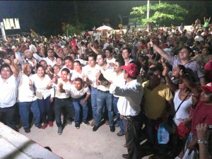 A su llegada a la Colonia San Miguel en Puerto Escondido, donde fueron cobijados por toda la gente del lugar, quienes en una sola voz, reiteraron su apoyo incondicional, a Freddy Gil Pineda Gopar como a los demás candidatos priistas que acompañaron a Pineda Gopar y se comprometieron al voto, 5 de cinco.