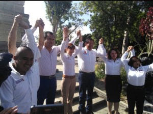 Los aspirantes a diputados locales Othón Cuevas, Hilda Pérez Luis, Dante Montaño, Oswaldo García Jarquín, para Presidente Municipal de Oaxacavde Juárez, así como los candidatos a diputados federales Benjamín Robles Montoya y Maribel Martinez quienes dieron a conocer la iniciativa 2 de Julio.