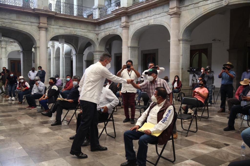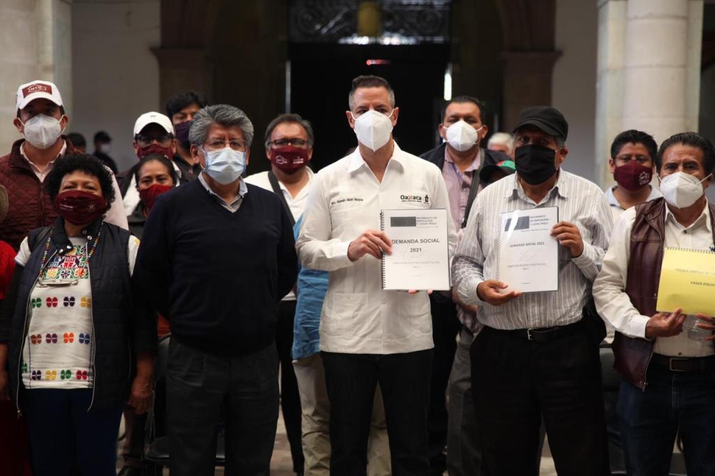 Oaxaca de Juárez, Oax. 5 de diciembre de 2020. El gobernador Alejandro Murat Hinojosa reconoció la disposición al diálogo de los representantes de las organizaciones del Movimiento de Unificación de Lucha Triqui (MULT), del Frente Amplio de Lucha Popular (FALP), y de la Asamblea de los Pueblos en Defensa del Territorio, la Educación Pública, Gratuita y los Derechos Humanos, quienes hicieron entrega de su respectivos Pliegos Petitorios, enmarcados en el pronunciamiento de paz en Oaxaca.