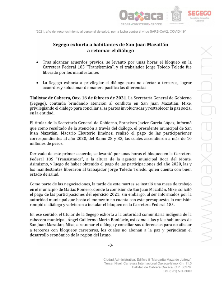 Derivado de este primer acuerdo, se levantó por unas horas el bloqueo en la Carretera Federal 185 “Transístmica”, a la altura de la agencia municipal Boca del Monte. Asimismo, y luego de haber obtenido el pago de las participaciones del año 2020, las y los manifestantes liberaron al trabajador Jorge Toledo Toledo, quien cuenta con buen estado de salud.