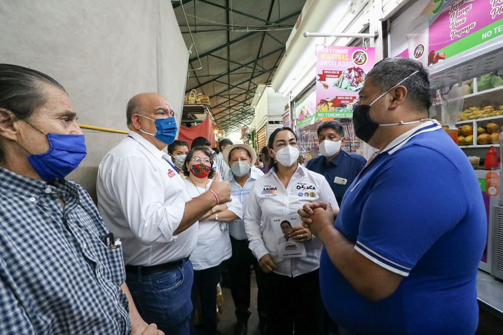 Acompañado en el recorrido por las candidatas a la diputación local, Geovana Anahí Moreno Reyes y Laura Vignon Carreño, así como integrantes de su planilla, el abanderado de la coalición “Va por Oaxaca”, escuchó en su tercer día de campaña, las demandas y necesidades de las locatarias y locatarios, reiterando su compromiso de apuntalar estos espacios comerciales, a través de esquemas de cierre y apertura y la ampliación de giros.