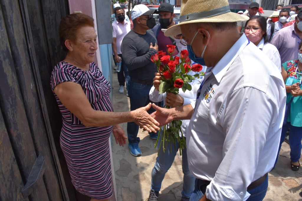 Entre muestras de cariño, el aspirante a la presidencia municipal caminó sobre la calle 5 de mayo, donde entabló un diálogo directo con personas que salían a su avance como Don Manuel Gómez Salinas, quien esperó al abanderado de «Va por Oaxaca» afuera de su domicilio.