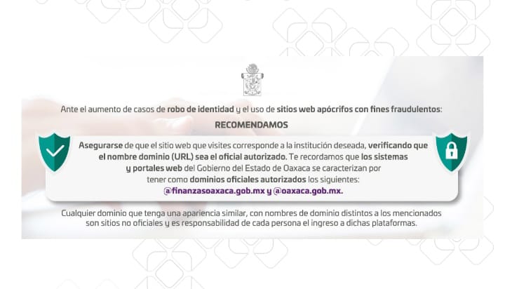 Recordando que los sistemas y portales web del Gobierno del Estado de Oaxaca, se caracterizan por tener como dominios oficiales y autorizados los siguientes: @finanzasoaxaca.gob.mx y @oaxaca.gob.mx Por lo que cualquier dominio que tenga una apariencia similar, con nombres de dominio distinto a los mencionados, estos son Sitios No Oficiales y es responsabilidad de cada persona el ingreso a dichas plataformas.