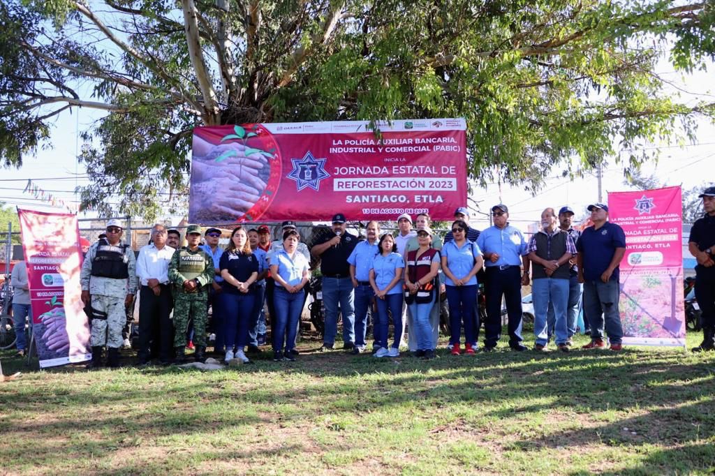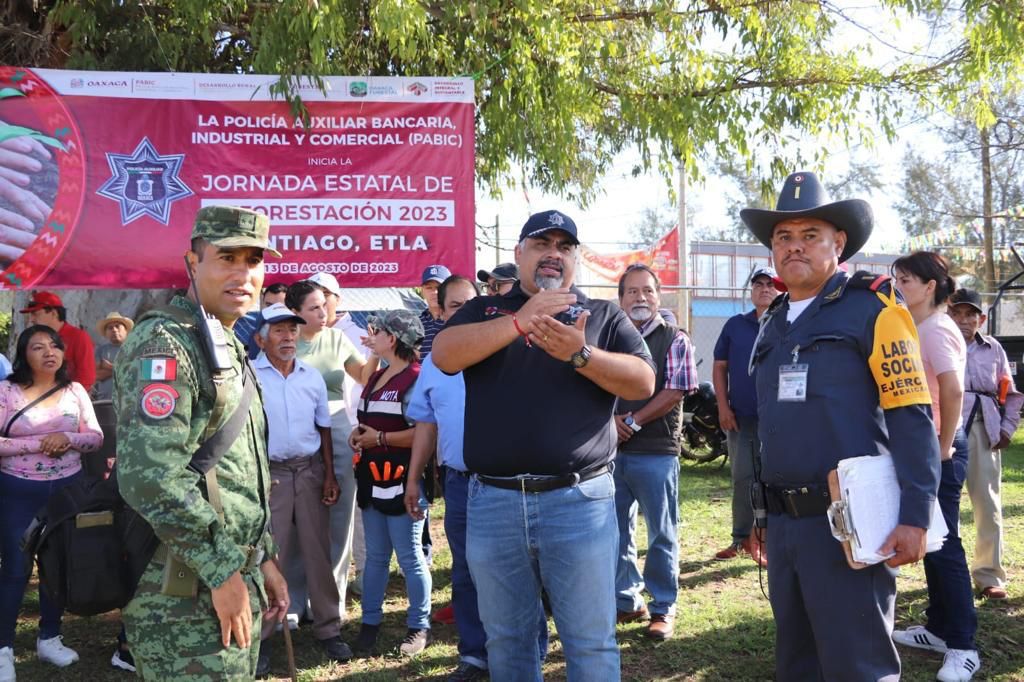 Se plantaron 600 ejemplares de especies endémicas de Oaxaca Oaxaca de Juárez, Oax. 13 de agosto de 2023.- Como parte de la iniciativa que impulsa el Gobierno del Estado de Oaxaca para la conservación de las áreas naturales, la Policía Auxiliar, Bancaria, Industrial y Comercial (PABIC) participó en la Primera Jornada Estatal de Reforestación 2023, realizada en Santiago, Etla. Encabezados por el director general, Alejandro Tejada y de manera coordinada con la Guardia Nacional (GN), la Secretaría de la Defensa Nacional (Sedena), autoridades municipales y ciudadanía de Santiago, Etla y de Oaxaca de Juárez; se realizaron labores para la plantación de 600 ejemplares de especies endémicas de nuestro estado. Esta actividad tiene como propósito fomentar la protección y cuidado del medio ambiente y espacios naturales, al tiempo de generar nuevas áreas verdes que brinden belleza al entorno y sean factores de equilibrio natural. Con estas acciones, la Secretaría de Seguridad y Protección Ciudadana (SSPC) a través de la PABIC, reitera su compromiso social de contribuir a la conservación del patrimonio natural, sentando las bases para el desarrollo integral y sustentable de Oaxaca. Alejandro Andrey Tejada Morales Salomón Jara Cruz Karina Barón Gobierno del Estado de Oaxaca